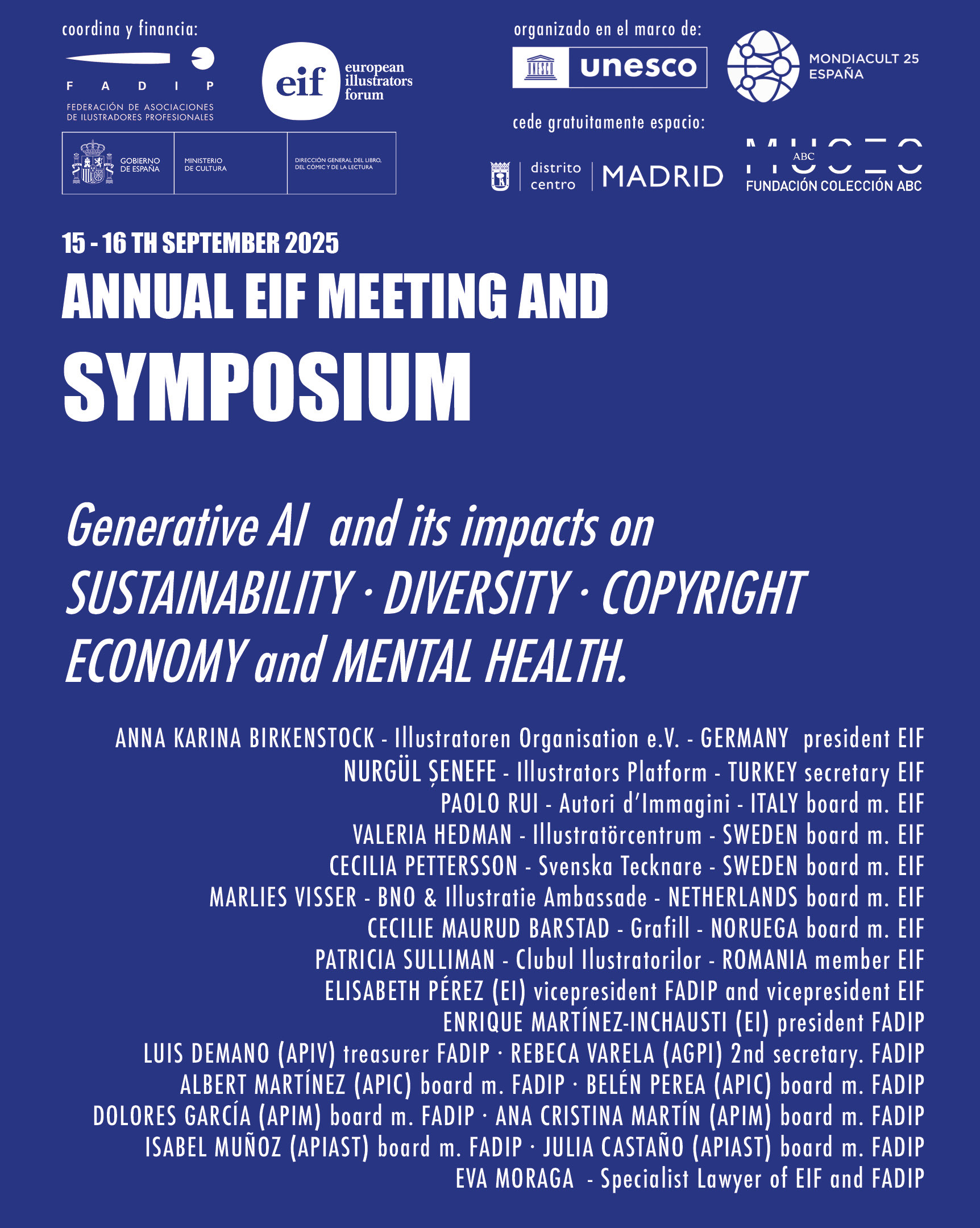 The European Illustrators Forum met in Madrid on 15 and 16 September to prepare for Mondiacult 2025. To discuss the threats posed by generative AI images to creators rights and its ethical impact on society. The international board members from all over Europe discussed the crisis in the creative sector caused by generative AI, exploitation, and loss of diversity. There is concern about the mental health of illustrators and the need to work together to find solutions for a sustainable future for people and planet.